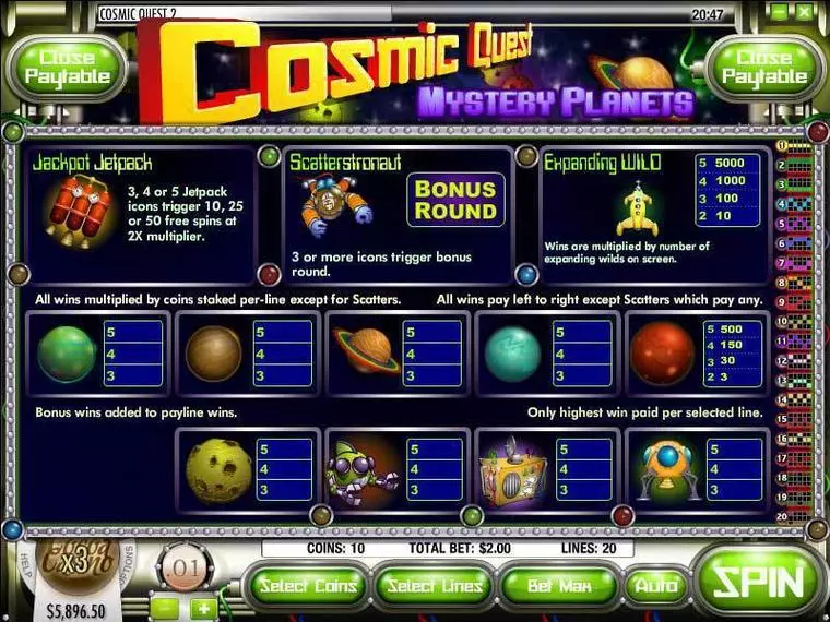 Cosmic Quest Episode Two is a 5 Reel / 20 Line mobile slot game, made by Rival in in February 2009