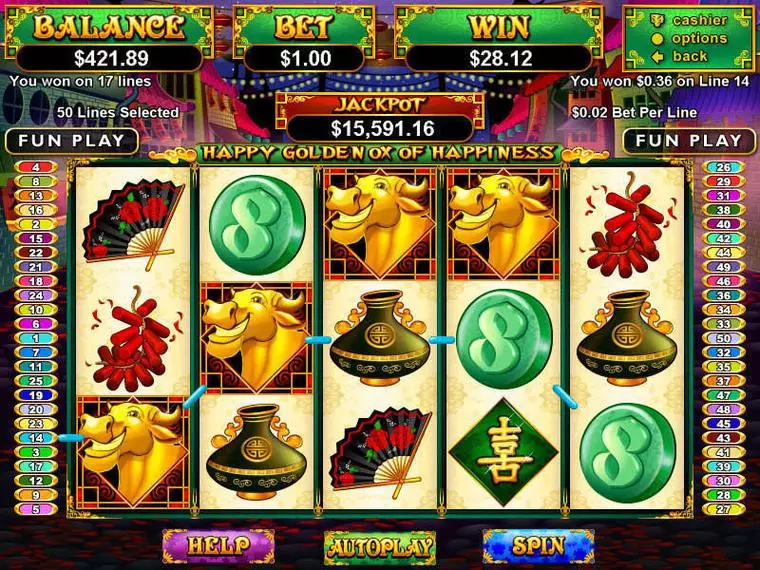 Happy Golden Ox of Happiness is a 5 Reel / 50 Line mobile slot game, made by RTG in in January 2009
