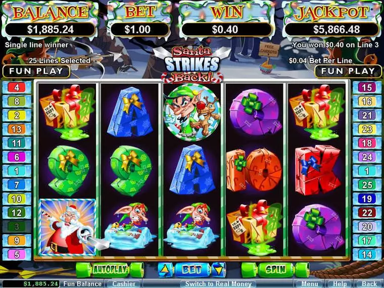 Santa Strikes Back! is a 5 Reel / 25 Line mobile slot game, made by RTG in in November 2009